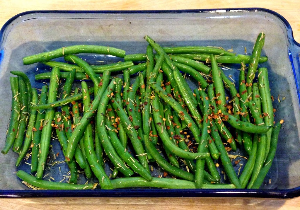 Add washed and trimmed green beans to a casserole dish. Pour oil over top of beans.